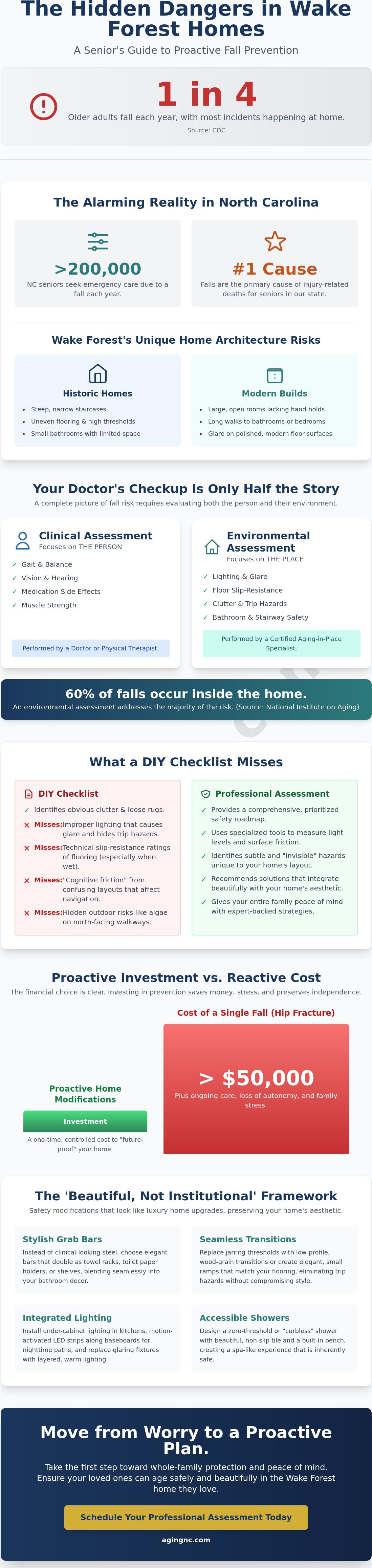 - Discover how a professional fall risk assessment for seniors Wake Forest identifies hidden hazards like improper lighting and slip-resistance ratings that DIY checklists often overlook.