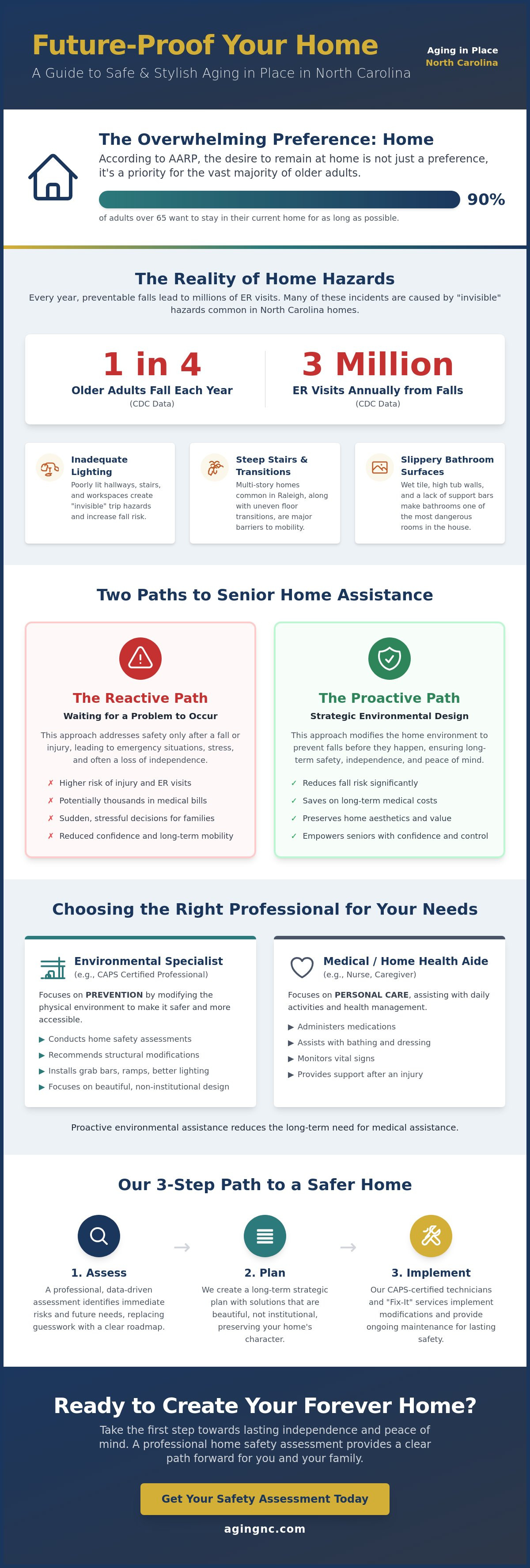 Stay in the home you love. For 90% of adults over age 65, this isn't just a preference; it's a priority, according to the AARP 2021 Home and Community Preferences survey. True home assistance for the elderly goes far beyond medical check-ups. It involves a holistic strategy to make your physical environment work for you. Understanding Aging in Place starts with recognizing that your house is a tool for independence. In the Research Triangle and Greensboro, we see a growing demand for future-proof living. This means shifting the focus from reactive repairs to proactive, strategic planning that ensures your home remains a sanctuary of dignity rather than a source of stress.