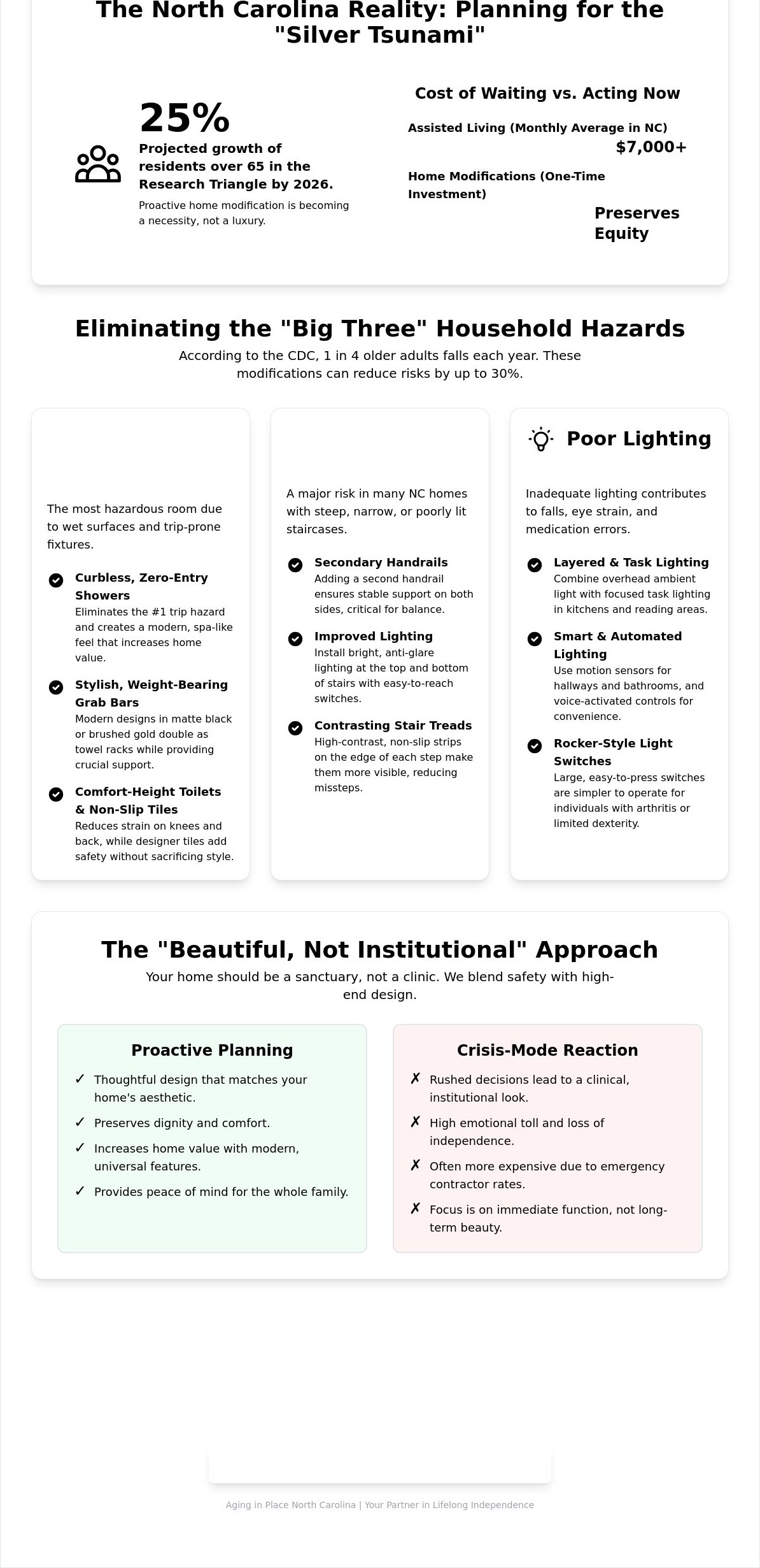 - Learn why proactive planning for North Carolina’s "Silver Tsunami" beats crisis-mode renovations, helping you maintain your independence and peace of mind.