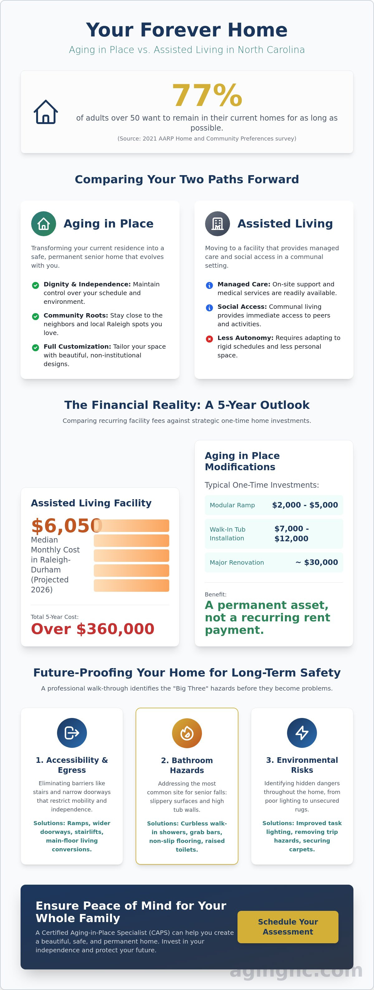 According to AARP, 77% of adults over 50 want to stay in their current home as long as possible. The challenge is figuring out how to make that safe, sustainable, and not something everyone in the family is quietly dreading. This guide lays out both options honestly, with real numbers and practical guidance for families in Raleigh and the broader Research Triangle.