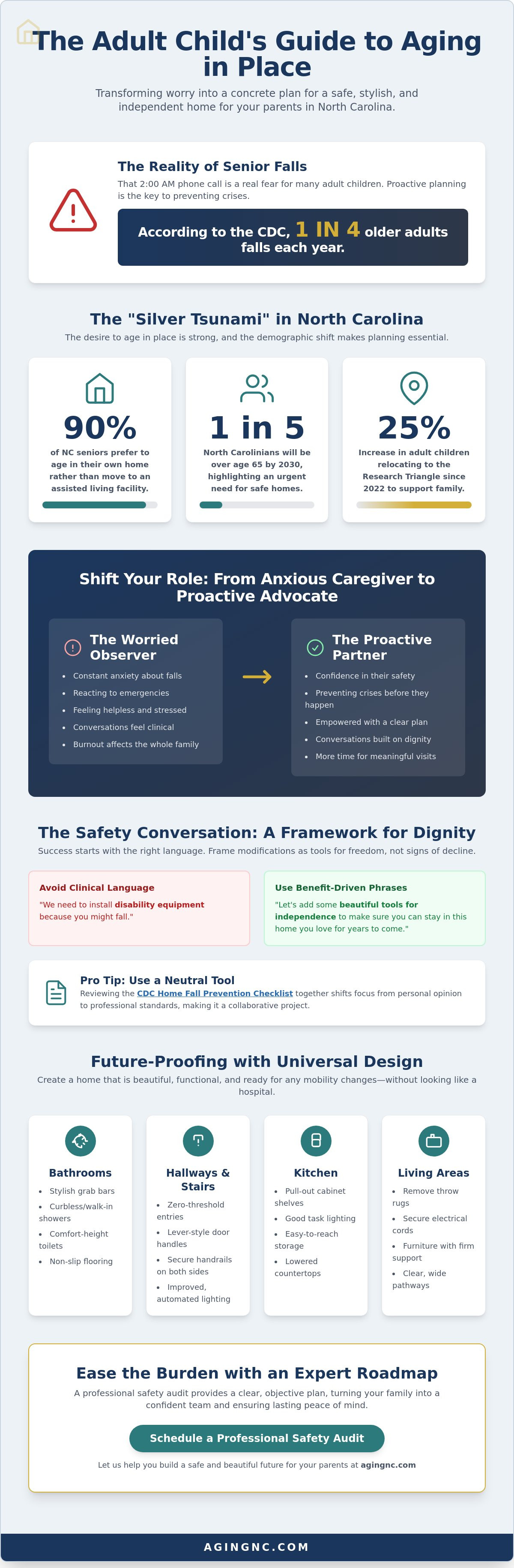 The aging population in Raleigh and Greensboro is growing at an unprecedented rate. By 2030, state data projects that one in five North Carolinians will be over age 65. This demographic shift makes being proactive essential for every local family. Waiting for a fall or a sudden medical emergency to modify a home often leads to rushed, stressful decisions that feel forced rather than chosen. The Silver Tsunami is a demographic shift requiring immediate home safety planning.